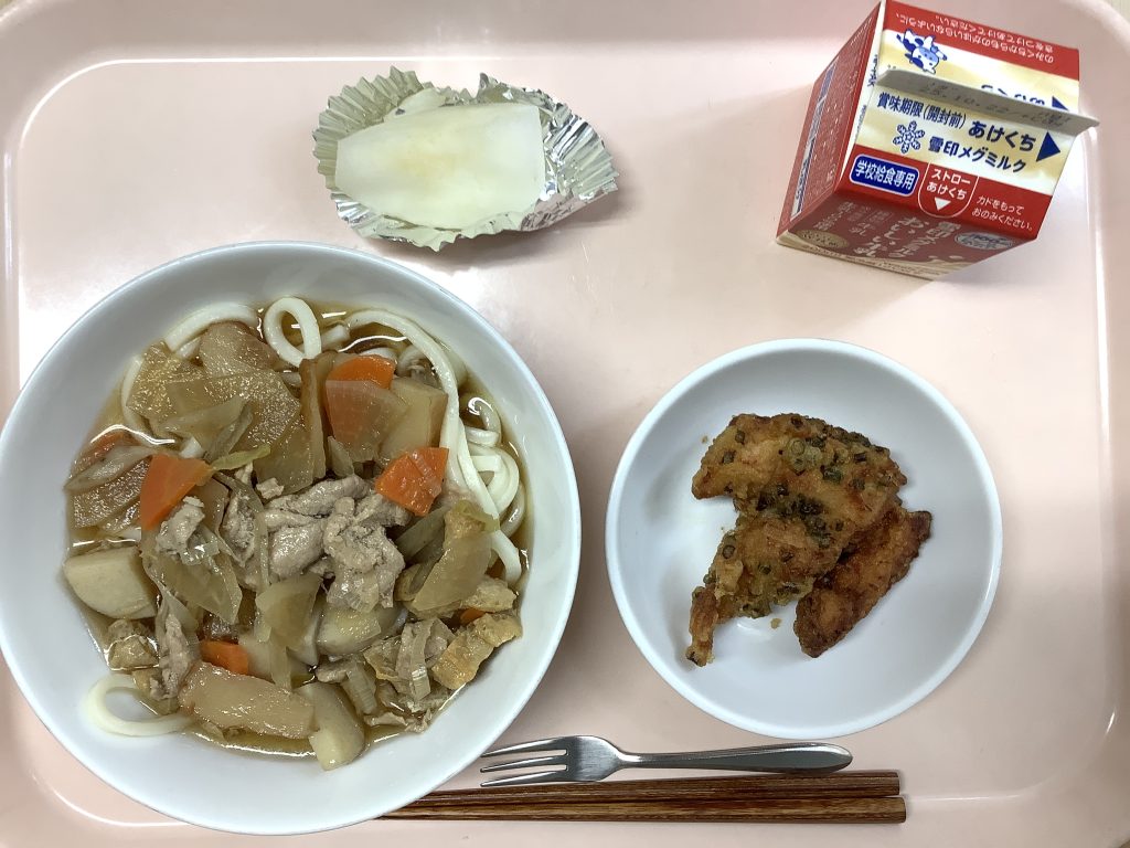 本日の献立 ・しっぽくうどん ・鶏ささみ揚げ ・梨(にっこり梨) しっぽくうどんは...