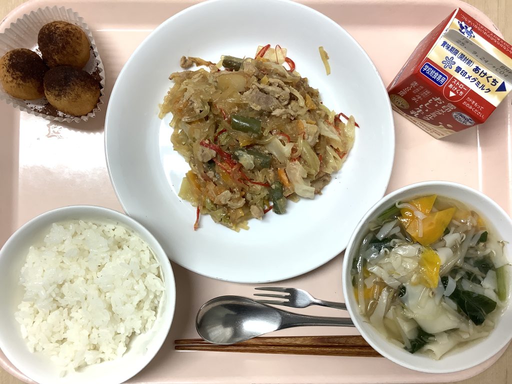 本日の献立 ・ごはん ・豚肉とキャベツのみそ炒め ・ワンタンスープ ・ココアボール...