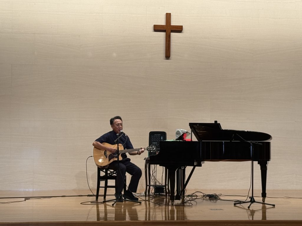 前期の最後にということで、陣内大蔵チャプレンによるミニコンサートが講堂で行われました。アメイジンググレースから始まり、神さまのお話を交えつつ、往年のヒット曲「僕...
