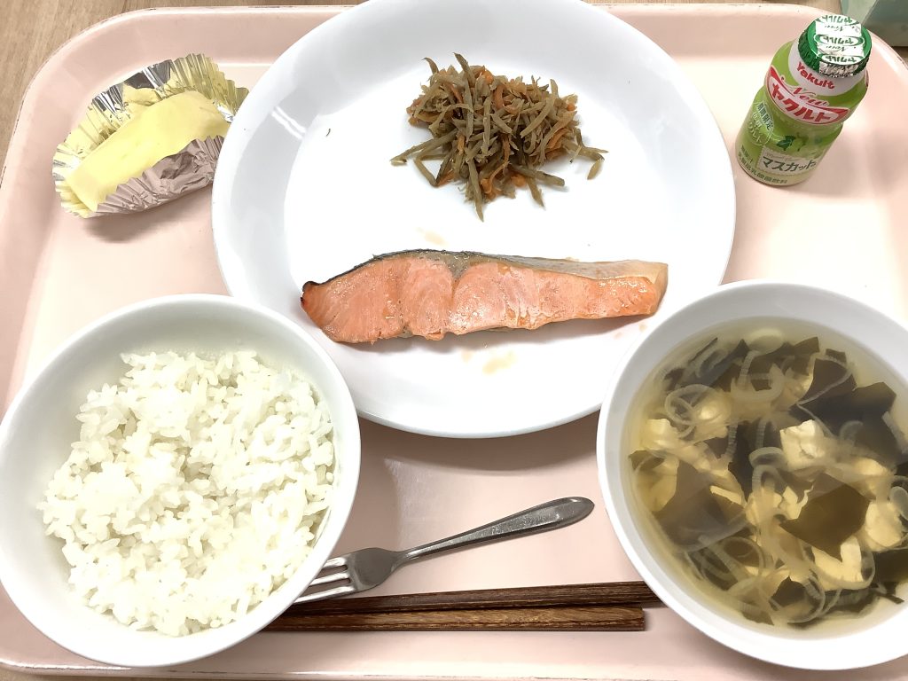 本日の献立 ・ごはん ・鮭の照り焼き ・きんぴらごぼう ・豆腐とわかめのすまし汁 ...