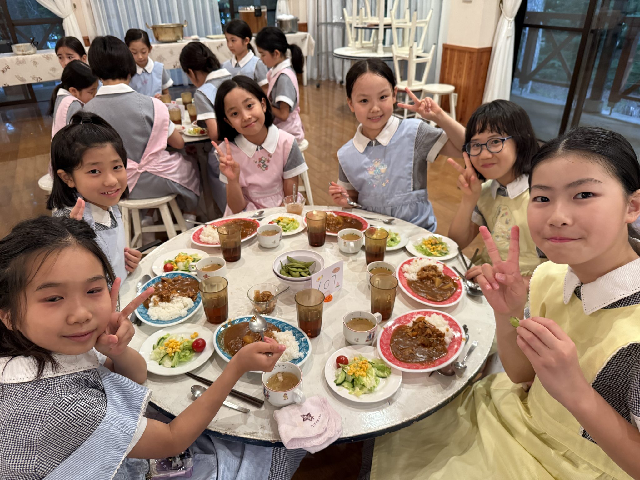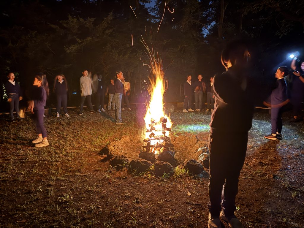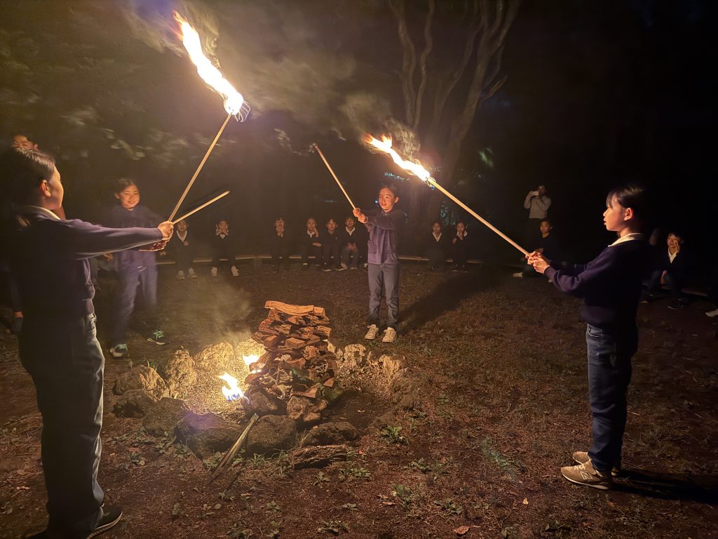 心配された雨ですが、追分寮の付近だけは奇跡的に大雨にならず、予定通りキャンプファイヤーも実施。東京で準備を重ねたレク係の子どもたちも担当の先生と大活躍。歌やゲーム、踊りと素晴らしいキャンプファイヤーとなりました。元気とパワーあふれる4年1組の子どもたちです。