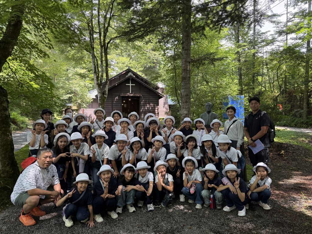しかし、午前中は写真のように快晴でしたので雨プロを発動するのももったいなく、急遽、予定を変更し、軽井沢発祥の父と呼ばれるA・C・ショー宣教師のショー記念礼拝堂へご案内し、礼拝堂の中を見学。軽井沢に現存する最古の礼拝堂として知られるショー記念礼拝堂は日本聖公会の中部教区の管轄。旧軽銀座を歩いてみながら、まずは軽井沢らしさを味わって、お昼は湯川ふるさと公園でお弁当をいただきました。遠くで雷鳴が聞こえたので、少し早めに切り上げて、追分寮に。