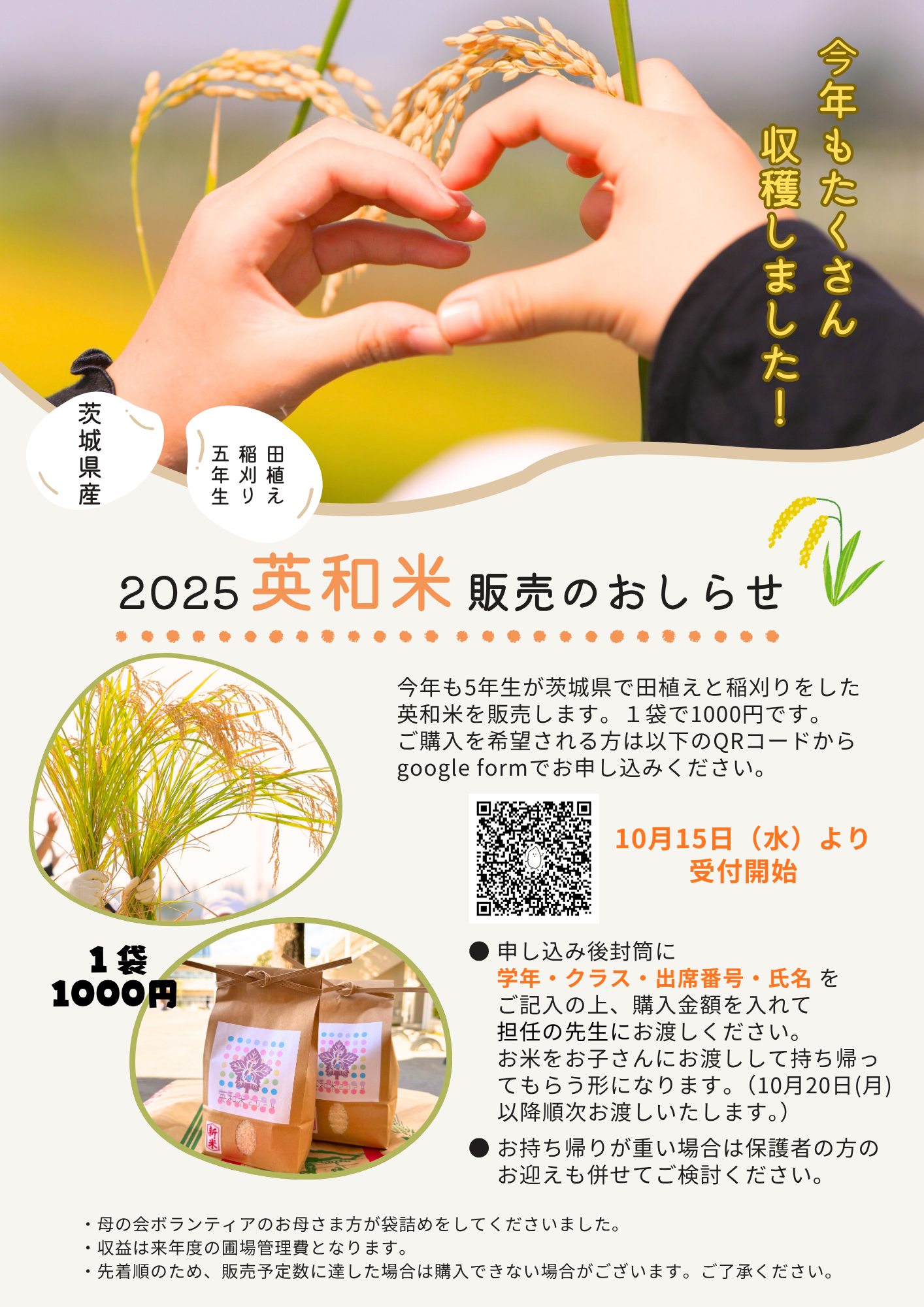 今年はできるだけ精米したての新米をすぐに食卓へ届けたいと考えて、注文販売形式での先着順とさせていただきます。米不足が話題の昨今、子どもたちが収穫した新米をいただけるのは幸せなことです。