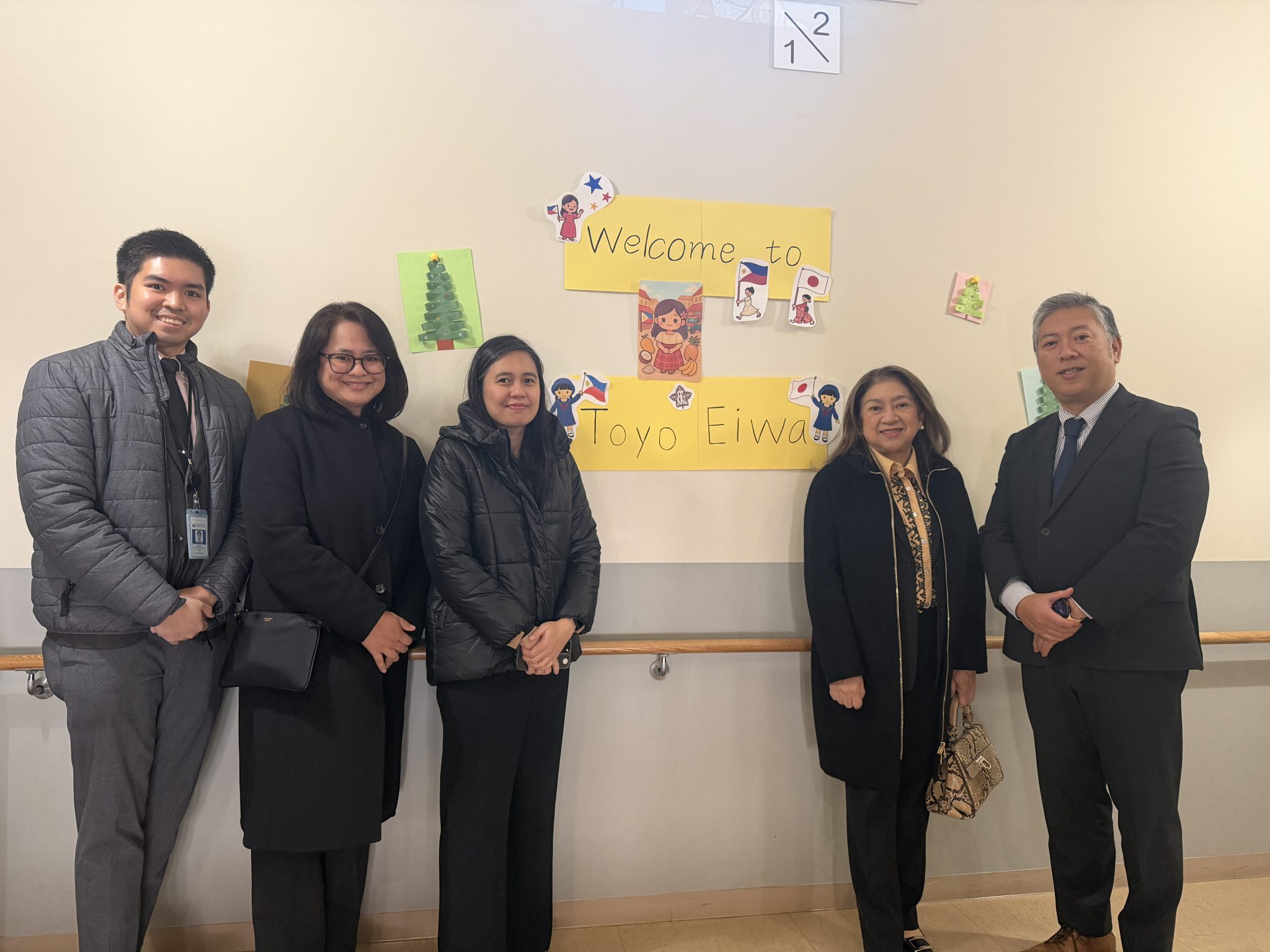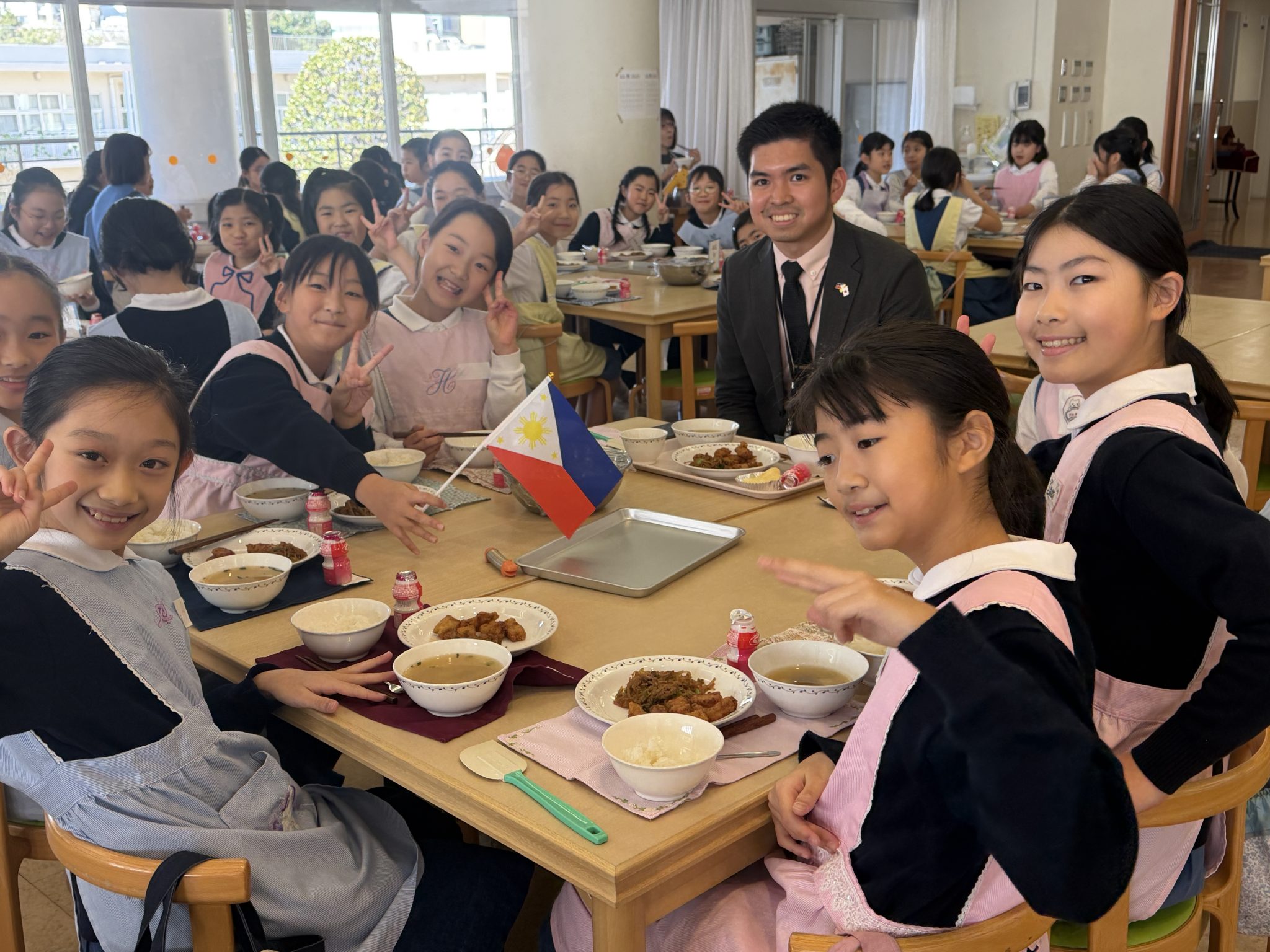 先日、文化研究クラブが訪問させていただいたことをきっかけに、フィリピンの特命全権大使ミレーン J.ガルシアーアルバノ大使が小学部を訪問してくださいました。小学部と道を挟んですぐ近く、お隣同士ともいえるフィリピン大使館さんですがこれまで交流らしき機会はほとんどありませんでした。今回はフィリピンと東洋英和女学院小学部の交流の記念すべき日ということで、校内のいたるところにフィリピンの国旗を掲げ、大使と外交官の皆さんを心を込めて歓迎いたしました。学校の様子、授業の様子をご覧いただき、給食も一緒に召し上がっていただきました。この日のメニューは「イカのかりんあげ」という子どもたちの人気メニュー。カナダ、韓国、オーストラリアそしてフィリピンと、子どもたちの興味や関心が世界に向かって広がっていく素晴らしい機会を与えられたことに感謝します。
