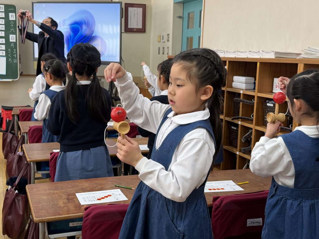 一年生の教室に鈴木康之先生が戻ってきてくれました。数年前に定年退職で英和を離れたあとも精力的に活動を続けておられる鈴木先生のけん玉指導。昔あそびの授業でした。とっても幸せな良い時間が流れていました♪