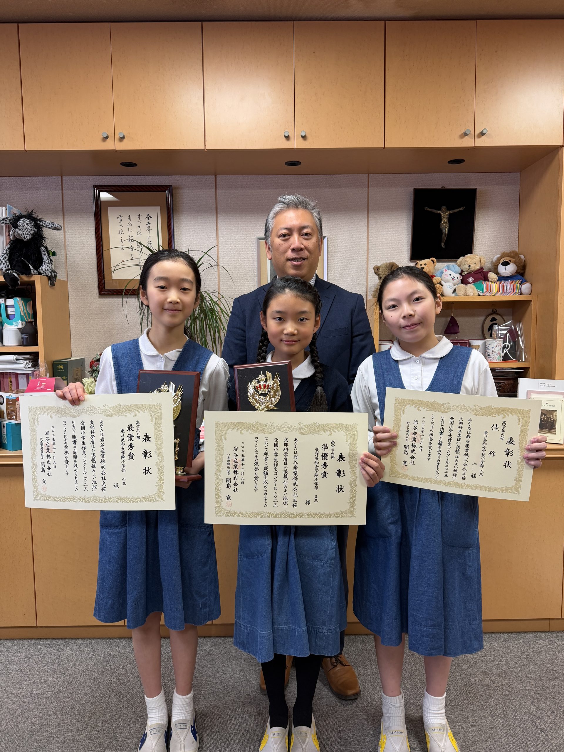 岩谷産業主催の「住みよい地球」全国小学生作文コンクールにて6年生と5年生の児童がそれぞれ最優秀賞、準優秀賞、佳作の賞をいただきましたので、部長室にて表彰式を行いました。