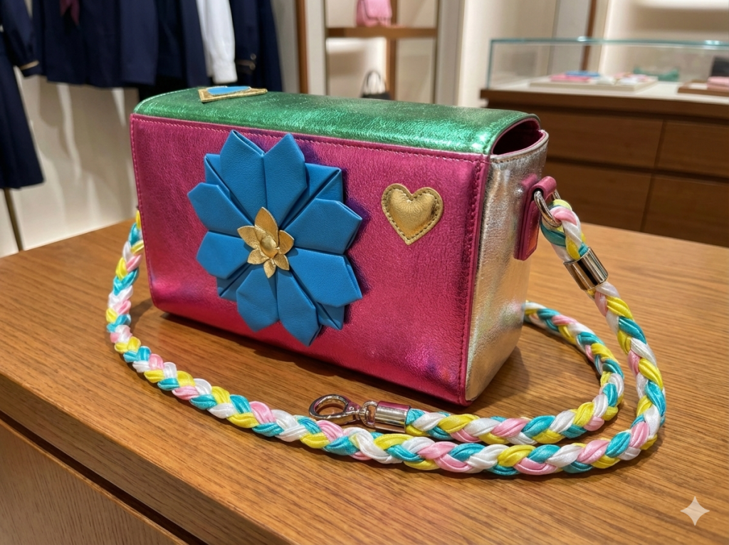 写真は1年生のキラキラバッグの作品。これをAIで商品化してみると、まるでサマンサタバサのようなお洒落バッグになりました。