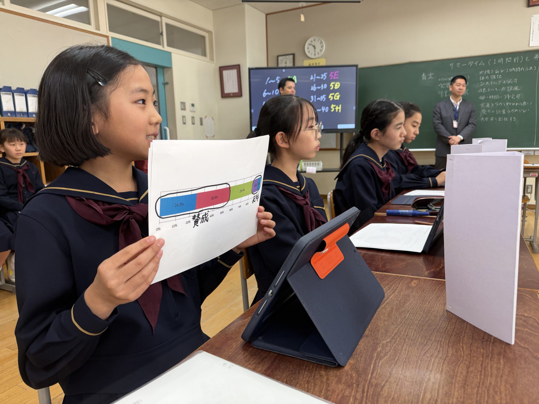 毎年恒例となっております父の会主催の親子討論会が行われました。数ヶ月前からサポーターのお父さま方によるディベートのレクチャーを受けた6年生が、それぞれのテーマごとにお父さまと5対5で激論を戦わせました。出張などでどうしても都合がつかないご家庭はお母さまが参戦されます。