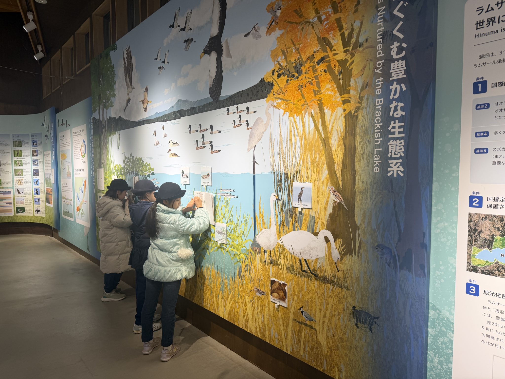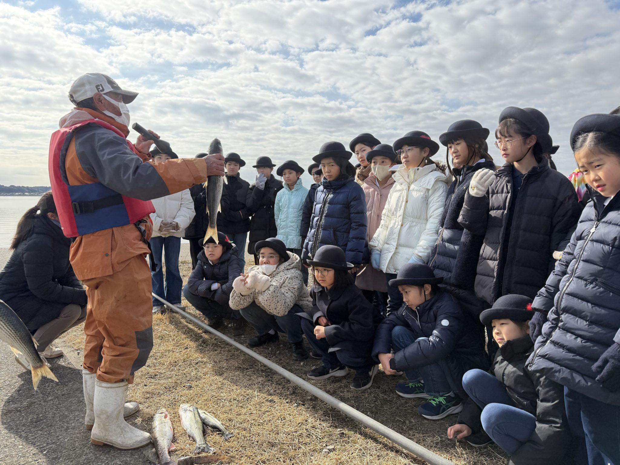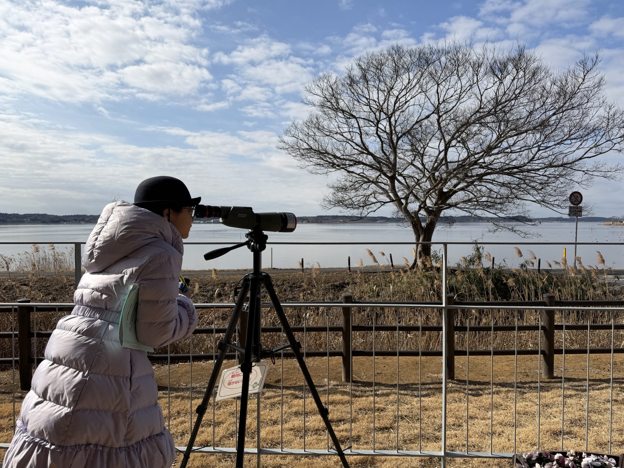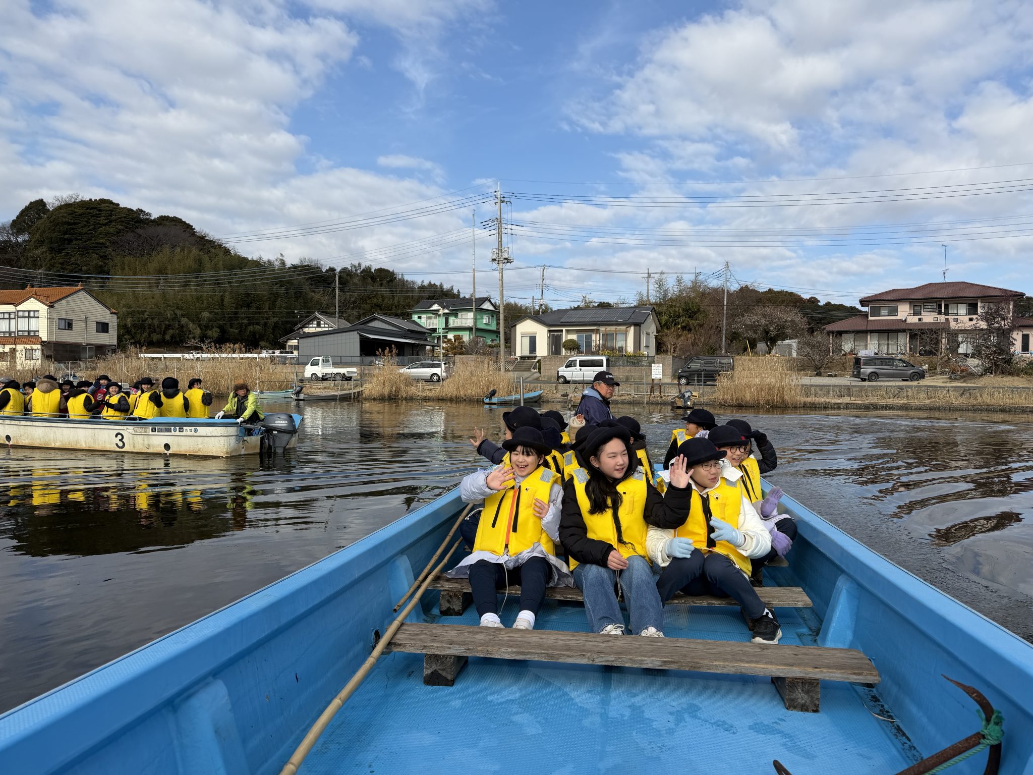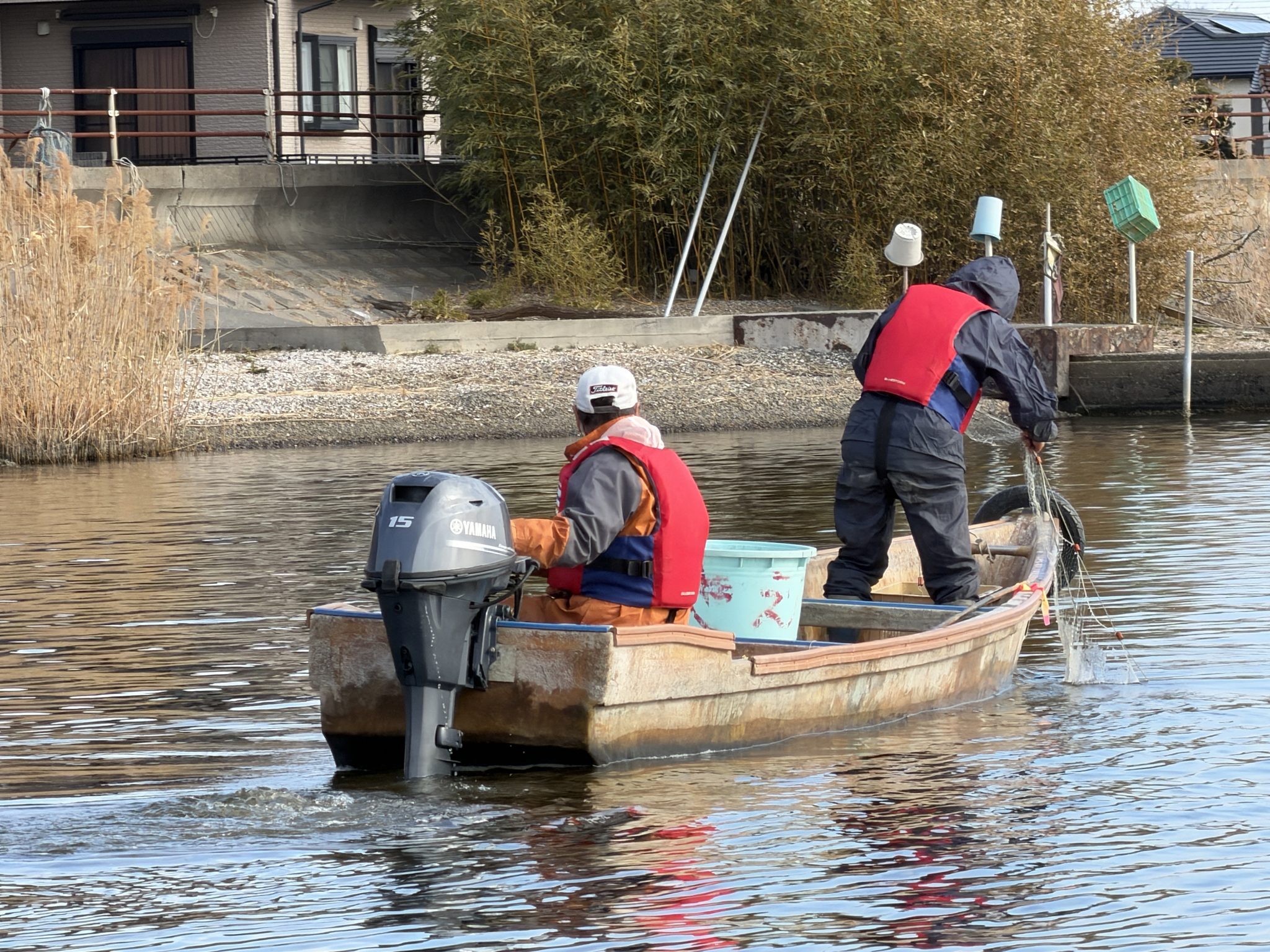 2日目は朝から涸沼湖の漁業について、地元の漁師さんからお話を伺いました。実際に目の前で網を上げて、お魚を見せていただきました。また水鳥センターでラムサール条約について、また涸沼の豊かな自然や生き物についてレクチャー。望遠鏡で水鳥の観察も行いました。(お隣のクラスは白鳥も見えたそうです)