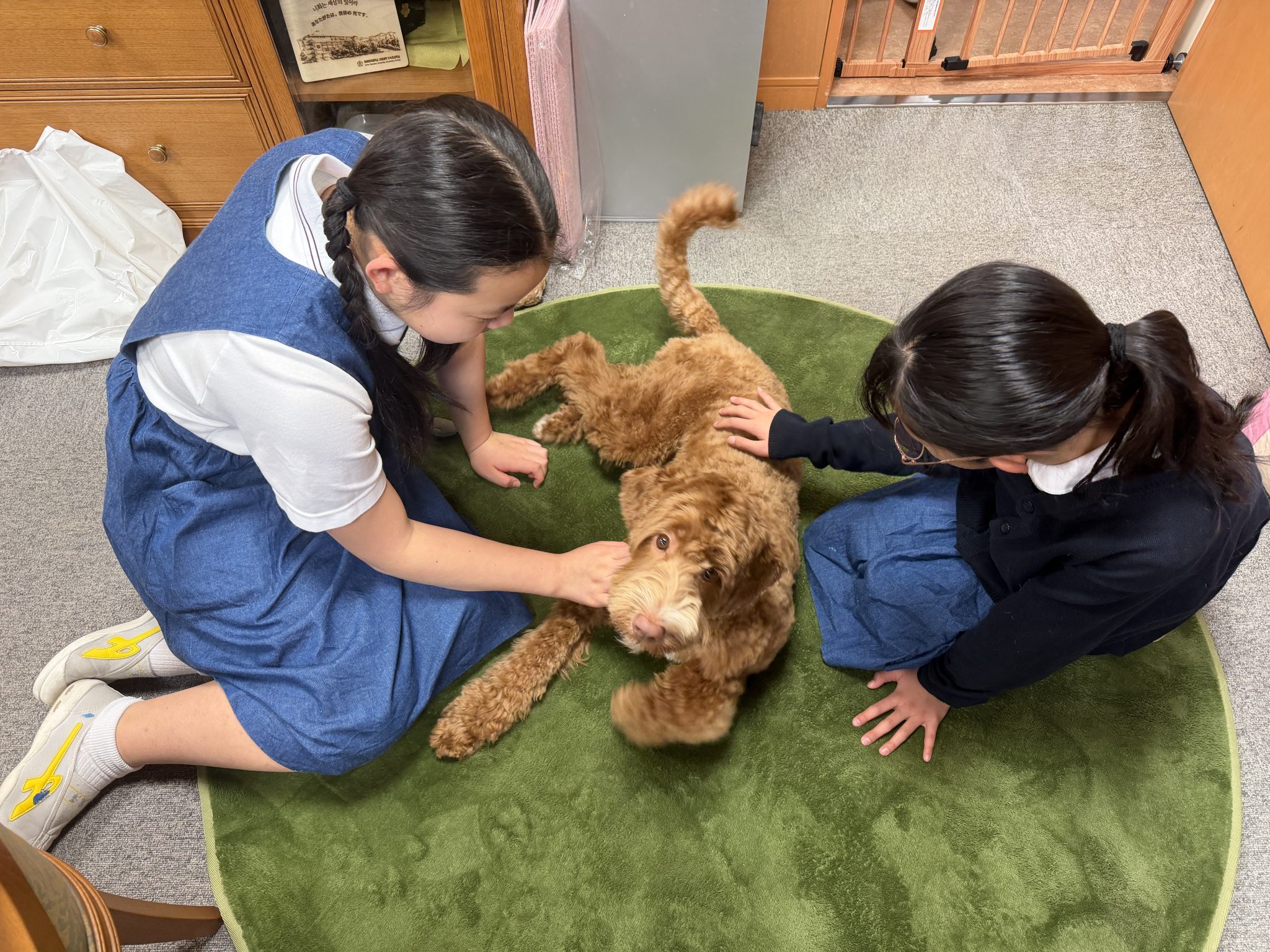 今日は20分休みに事前通告なしの抜き打ち避難訓練が行われました。いつものようにアンちゃんと遊んでいるところに緊急放送のアナウンス。「大地震が発生しました。机の下に潜って安全を確保してください。」子どもたちは必死で机の下に隠れようとしますが、部長室の長机では難しい〜。最後はヨギボーを頭から被っていましたが、アンは何の遊びなの?と大はしゃぎでした。