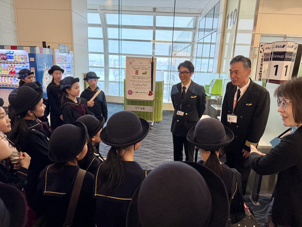 早朝6時すぎに羽田空港へ集合。今回も日本航空さんへ搭乗。出発前に空港で今日のフライトの機長さんお二人が英和の子どもたちをお出迎えしてくださり、みんなでご挨拶。機内でも英和の子どもたちへのアナウンスをしていただき、緊張していた子どもたちも笑顔に。特別なお心遣いと快適なフライトに感謝です!