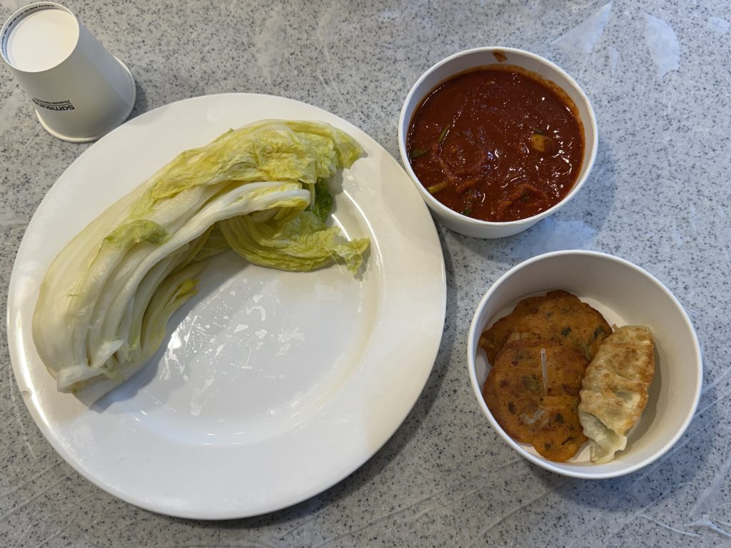 その後、通仁市場を見学したのに、キムチ作り体験。美味しいチヂミや韓国のお菓子をいただき、大満足の1日目となりました。