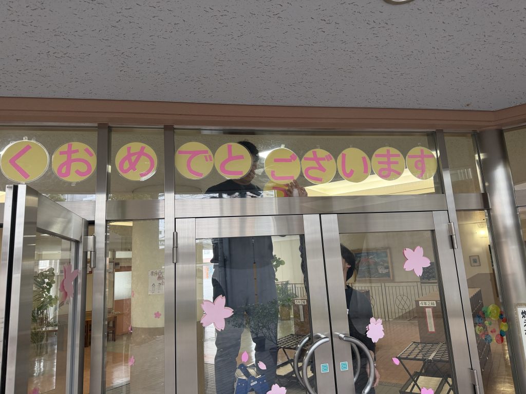 教職員も総出で講堂や食堂の準備に大忙し。昇降口で何やら困った様子の二人。「スペースが足りない?」「す、を右へ?」など、楽しそうに準備してくれていました。