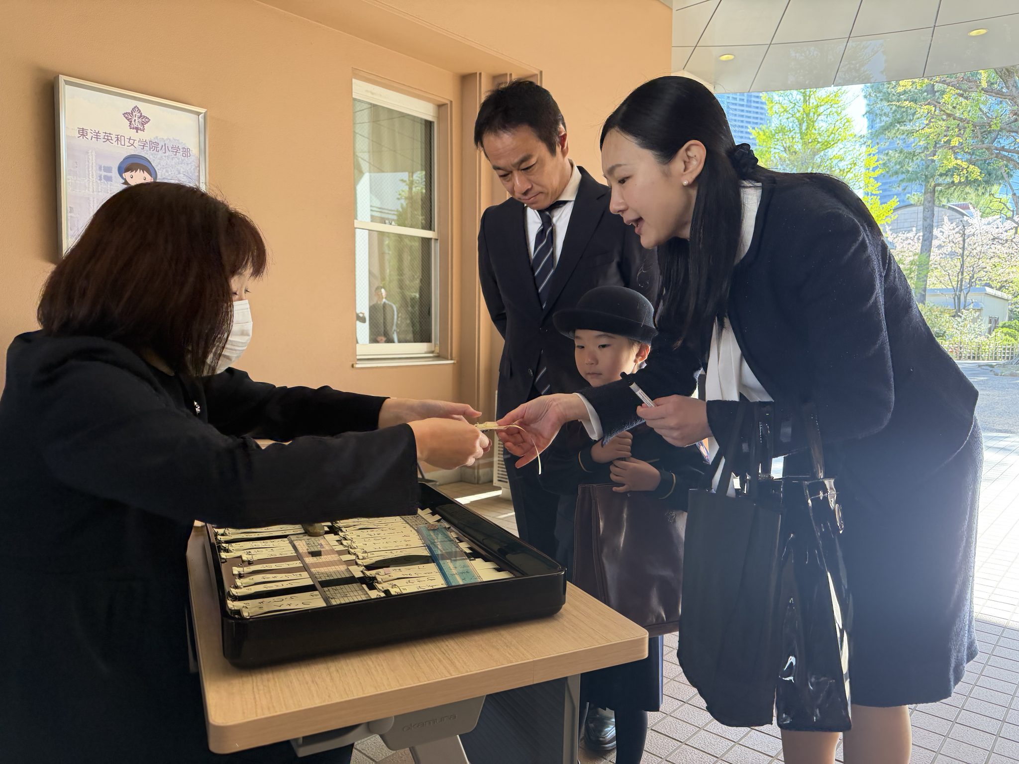 一年生の入学式。気持ちの良い青空のもと、桜の花も綺麗に咲いて新一年生のご入学をお祝いしてくれているようでした。