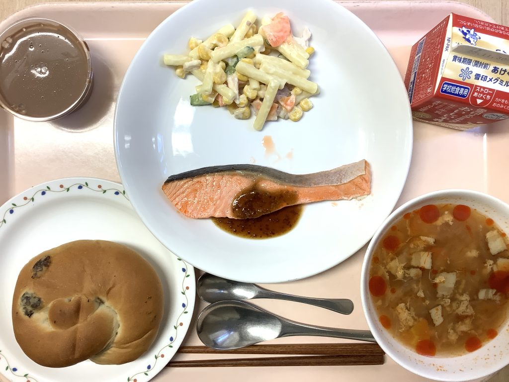 本日の献立 ・レーズンロール ・鮭のメープルマスタードソース ・マカロニサラダ ・イタリアンスープ ・チョコミルクプリン 今日は英和生におなじみのメープル給食だ...