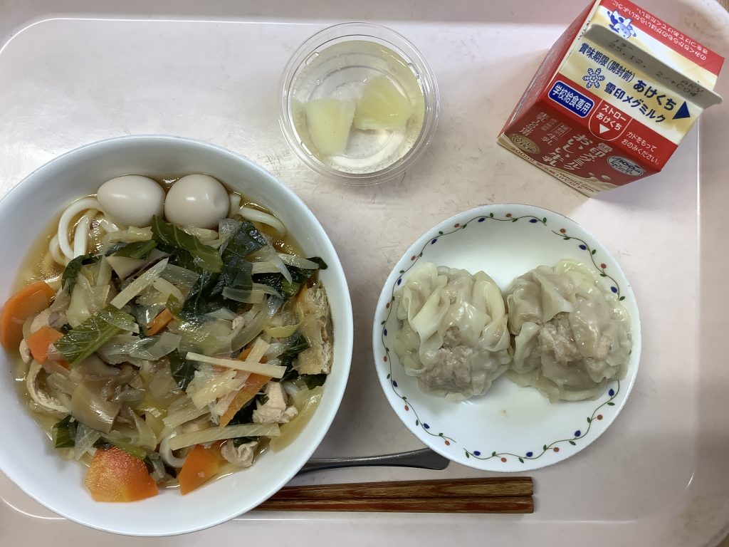 本日の献立 ・五目うどん ・ジャンボしゅうまい ・パイン入りサイダーゼリー おうど...