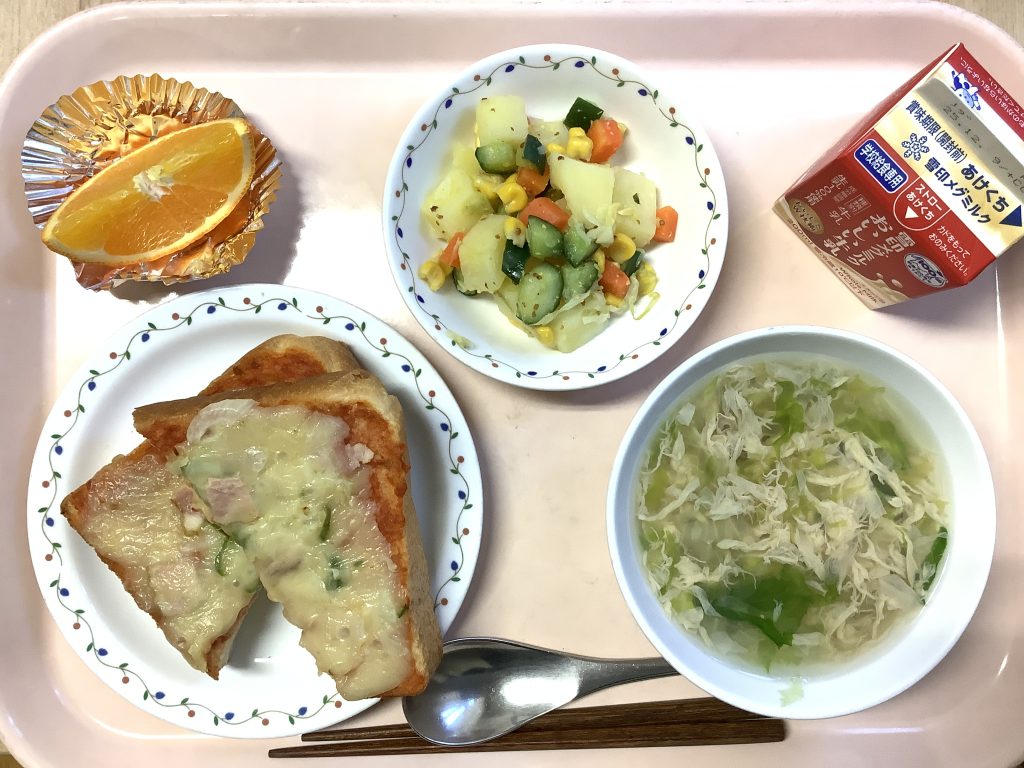 本日の献立 ・ピザトースト ・メープルマスタードサラダ ・洋風卵スープ ・オレンジ...