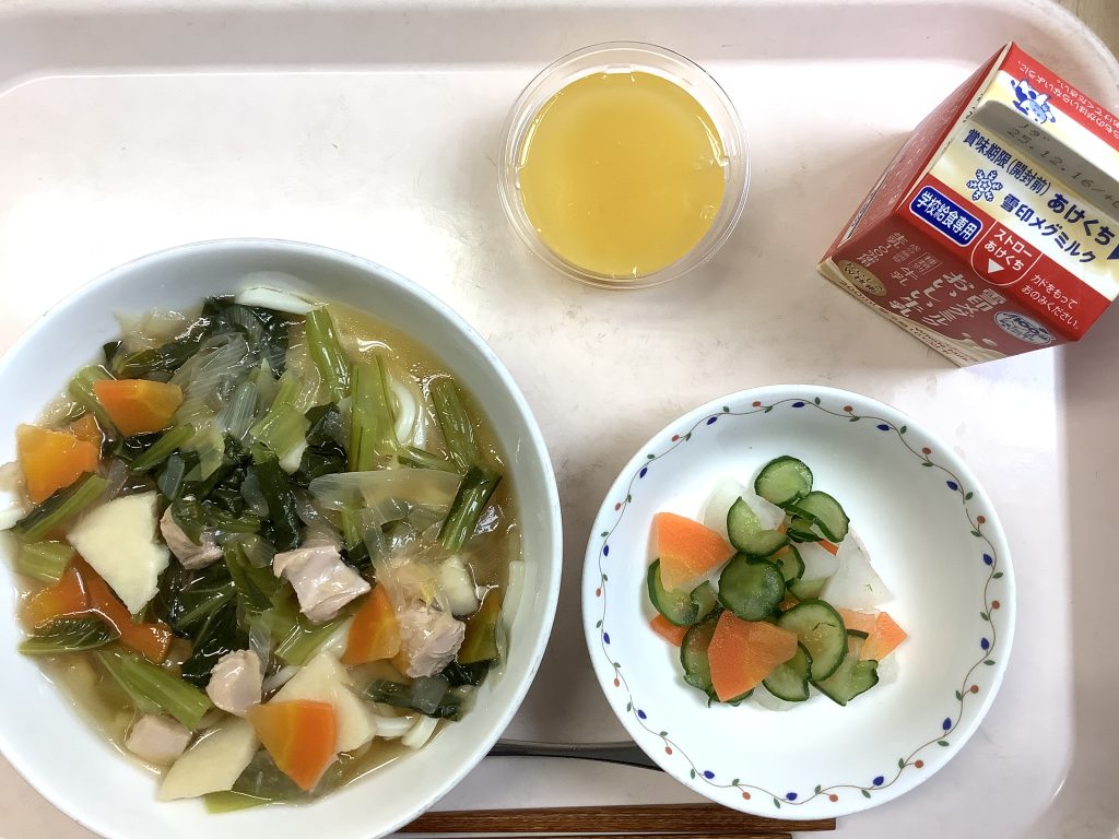 本日の献立 ・けんちんうどん ・一塩野菜 ・2層オレンジゼリー うどんは、優しく、...