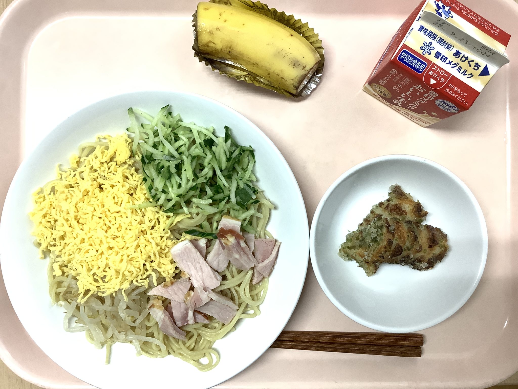 ・冷やし中華 ・ちくわの磯辺揚げ ・バナナ ・牛乳