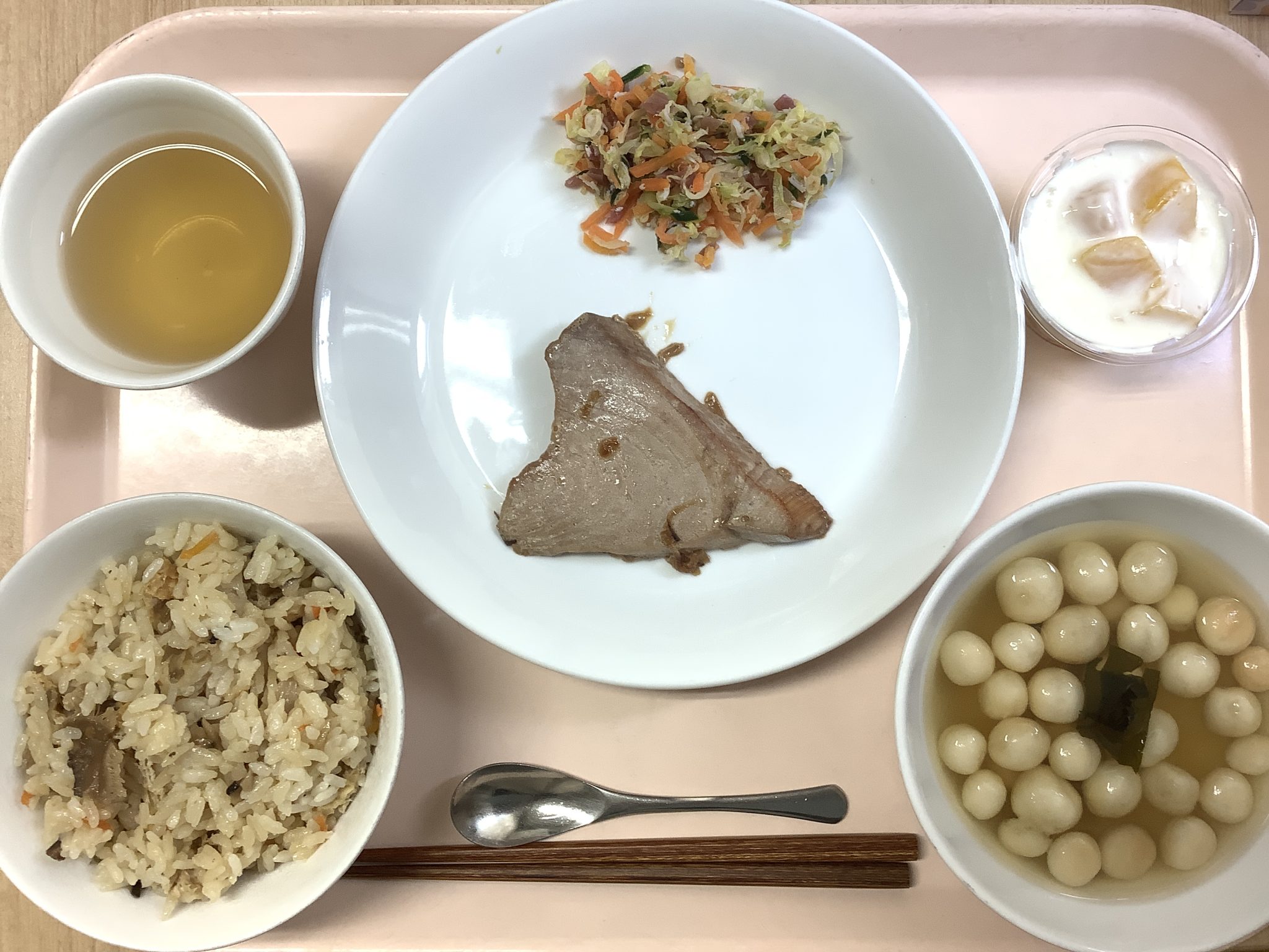 ・きのこおこわ ・鰹の香味焼き ・梅しらす和え ・わかめと麩のすまし汁 ・ピーチヨーグルト