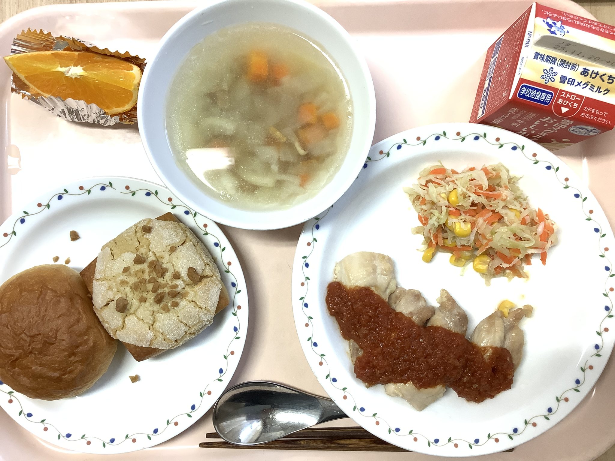 ・メープルパン ・チキンのトマトソース添え ・キャベツのオリーブサラダ ・コロコロ野菜スープ オレンジ