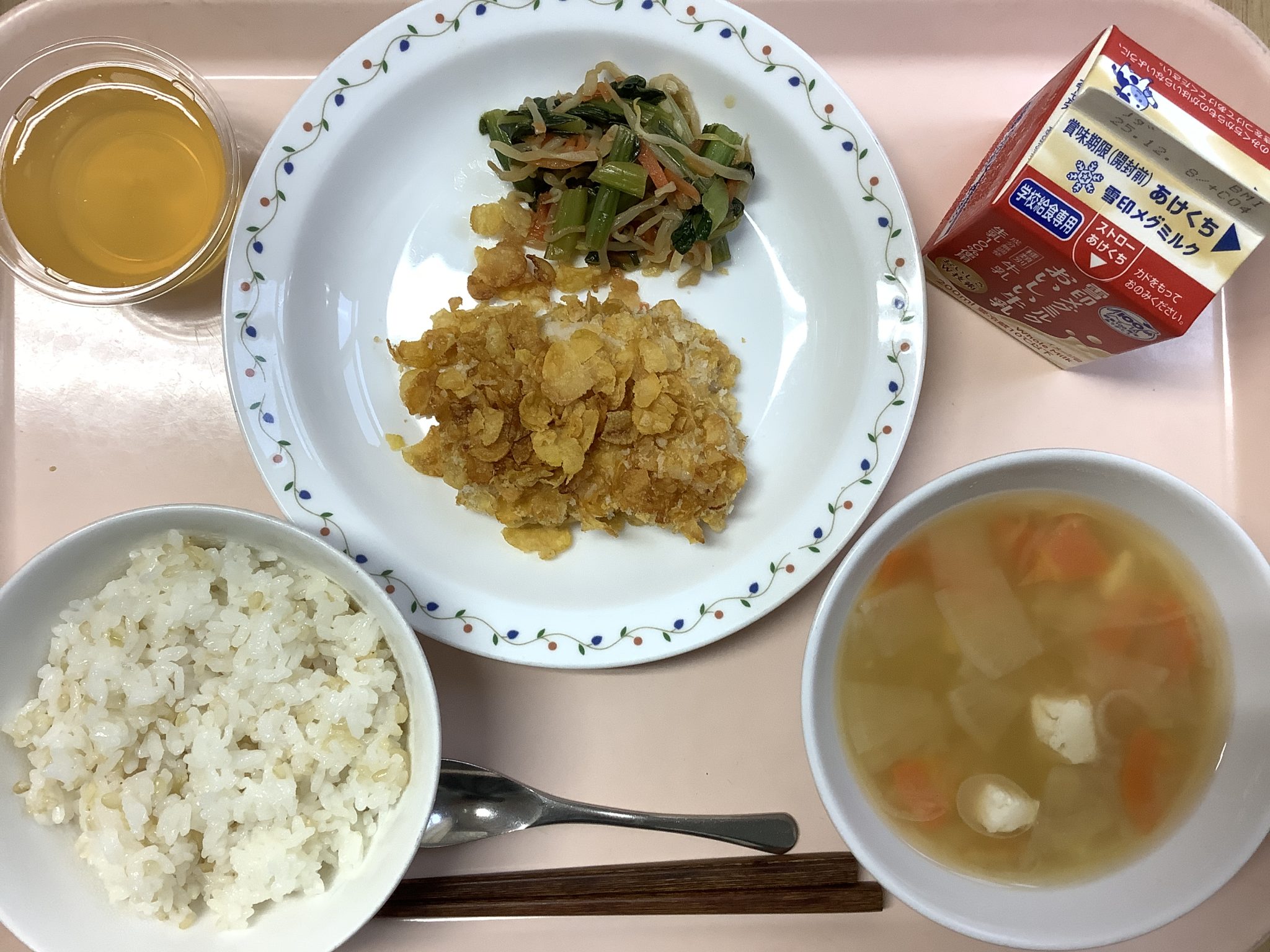 ・発芽米ごはん ・鶏肉のコーンフレーク焼き ・小松菜のサラダ ・呉汁 ・メープルレモンゼリー