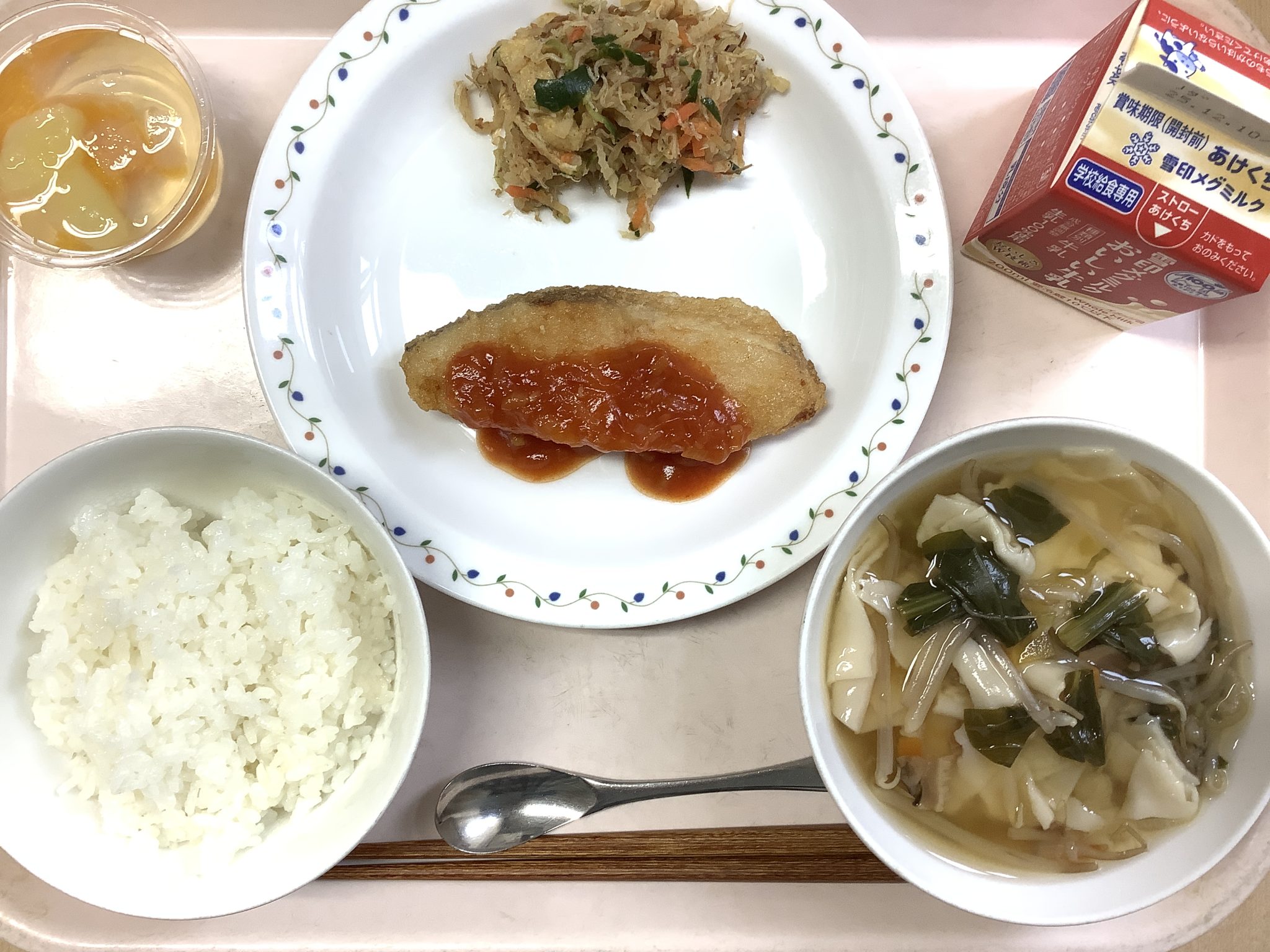 ・ごはん ・白身魚のチリソース ・大根と油揚げの和え物 ・ワンタンスープ ・フルーツ寒天