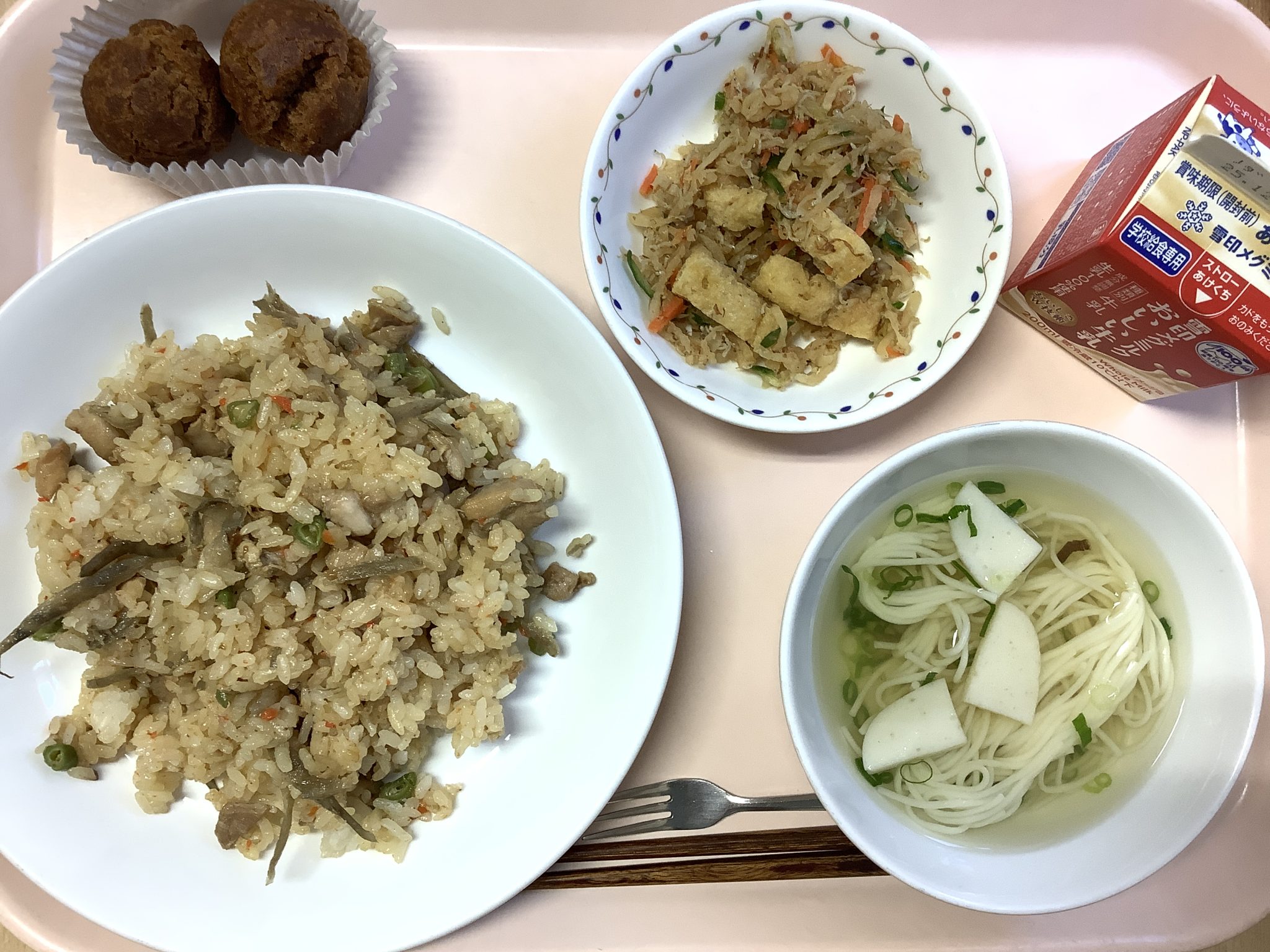 今日の給食、鶏ごぼうご飯は、味付けが濃くなくて美味しかったです。