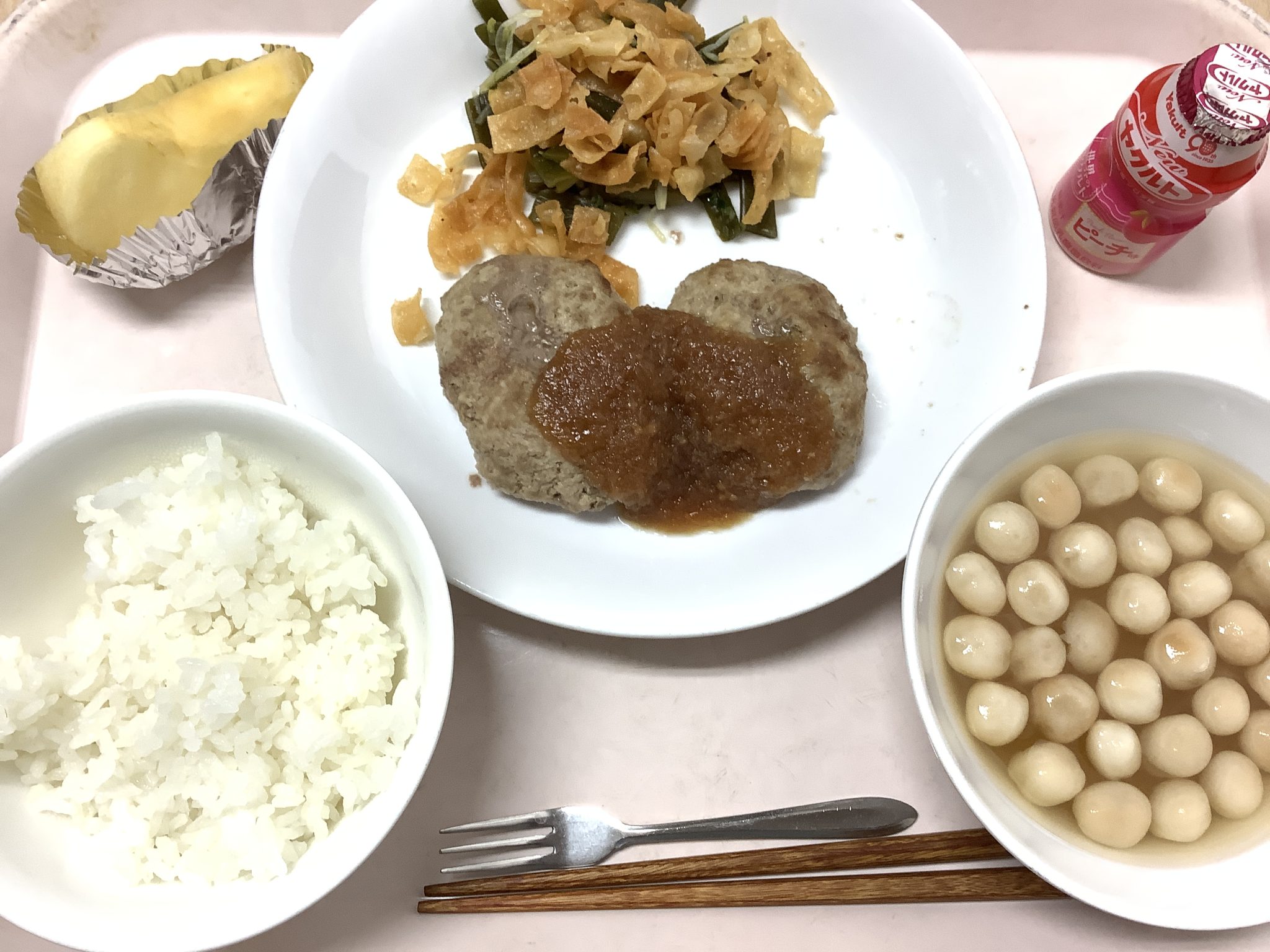 ・ごはん ・豆腐入りハンバーグ ・茎わかめのサラダ ・えのきと麩のすまし汁 ・りんご ・ヤクルト(ピーチ味)