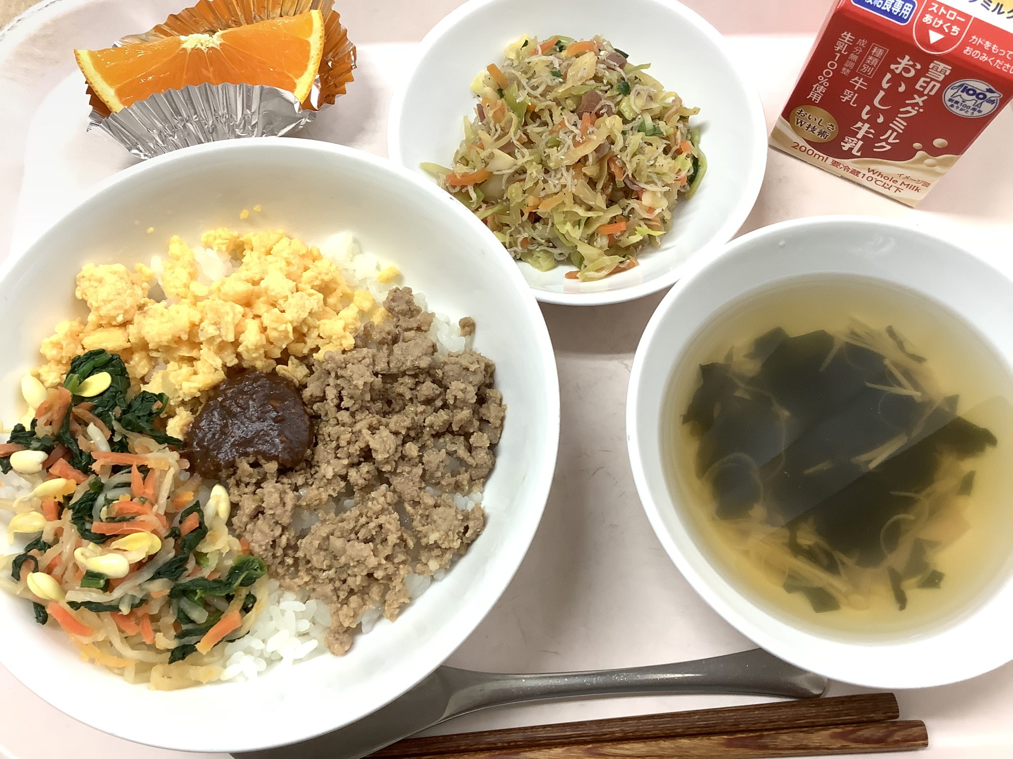 ・ビビンバ ・梅しらす和え ・わかめスープ ・清美オレンジ