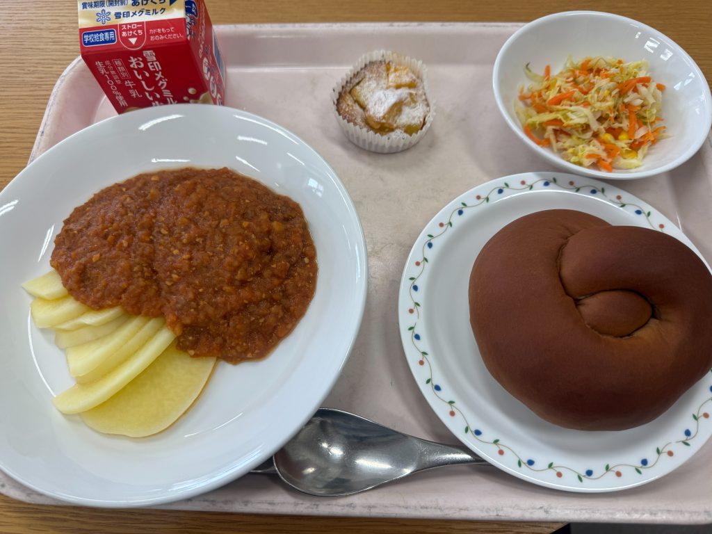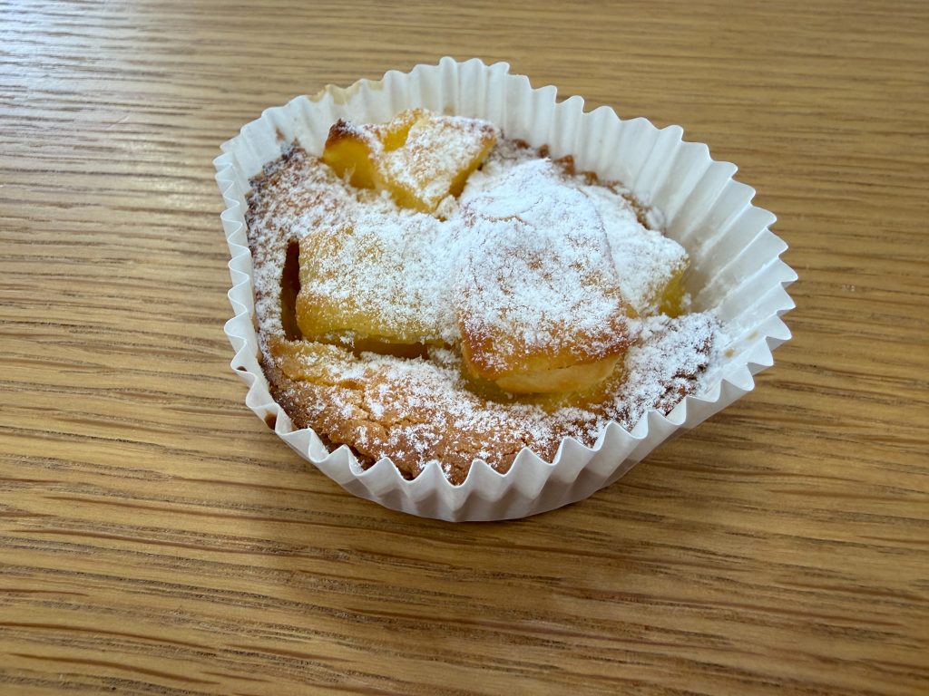 ポテトのミートソース、デザートのりんごのクラフティの2品が新メニューでした。りんごのクラフティは、コーンフレークを敷き詰めた上に、卵と小麦粉、生クリームと砂糖が入った生地、上には煮詰めたりんごと3層に。コーンフレークのザクザク感と、りんご入りの生地が混ざり合った食感も楽しめるデザートでした。